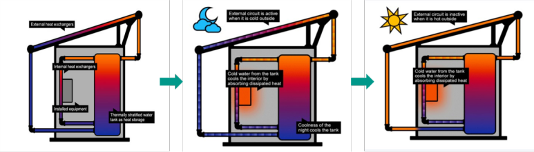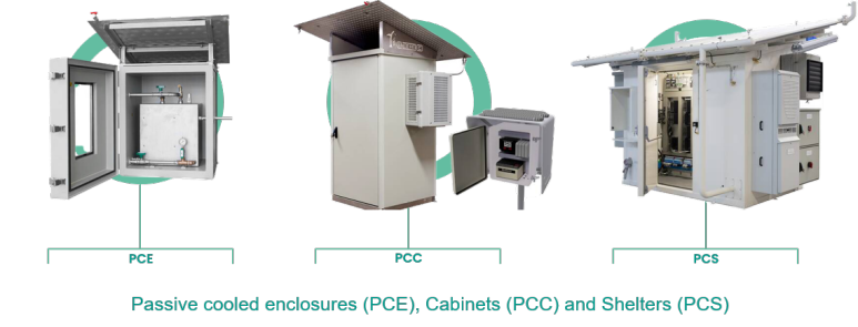 Passive cooled enclosure 는 악조건의 기상에서의 무 전력 또는 소량의 전력으로 온도를 유지 할 수 있습니다.