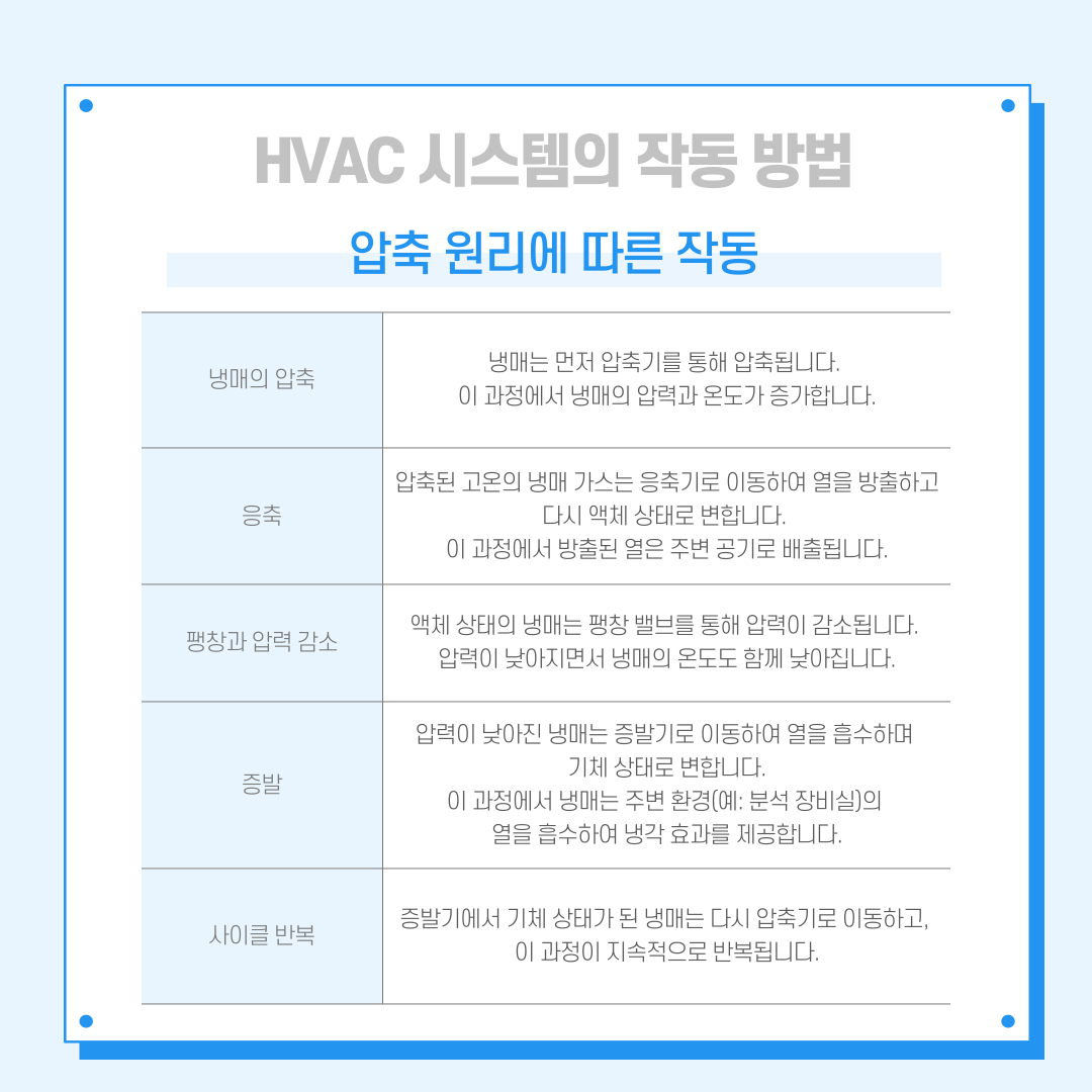 -> 이러한 과정을 통해 HVAC 공조 시스템은 설정된 온도를 유지하며, 주어진 공간을 효율적으로 냉각하거나 가열할 수 있게 됩니다.