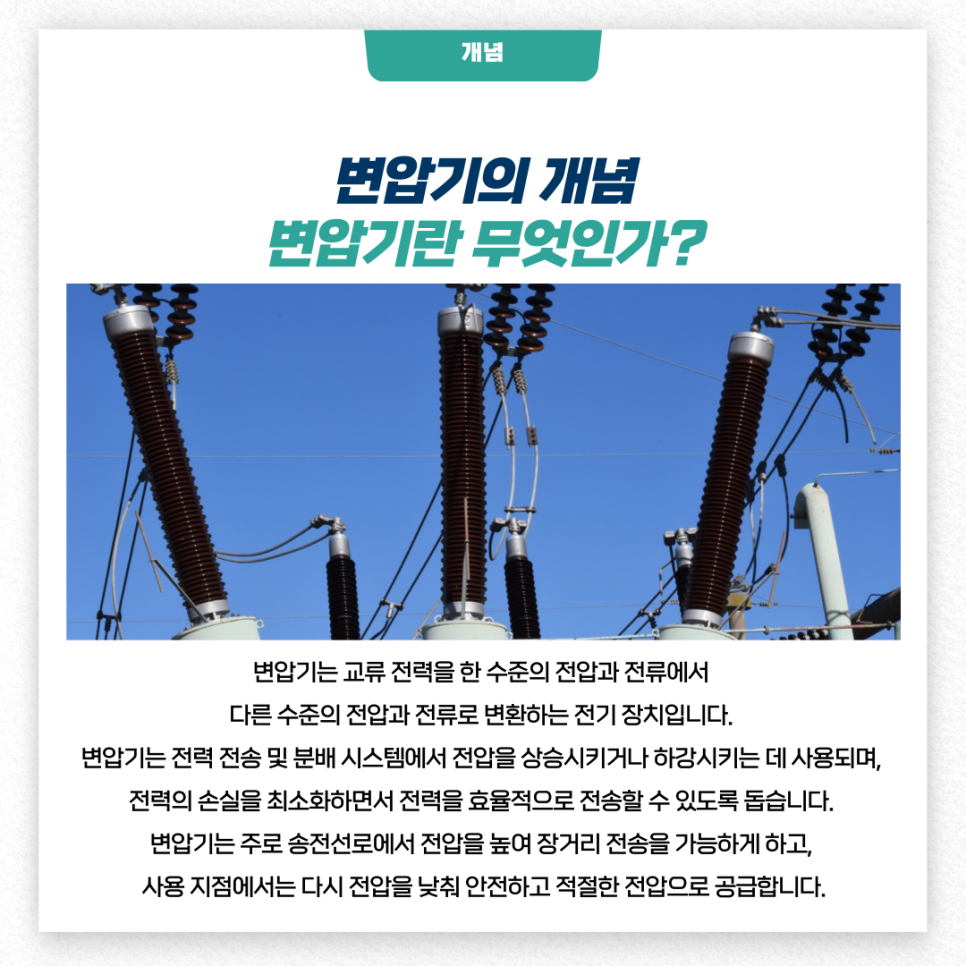 변압기는 전력 전송 및 분배 시스템에서 전압을 상승시키거나 하강시키는데 사용되며, 전력의 손실을 최소화하면서 전력을 효율적으로 전송할 수 있도록 돕습니다.