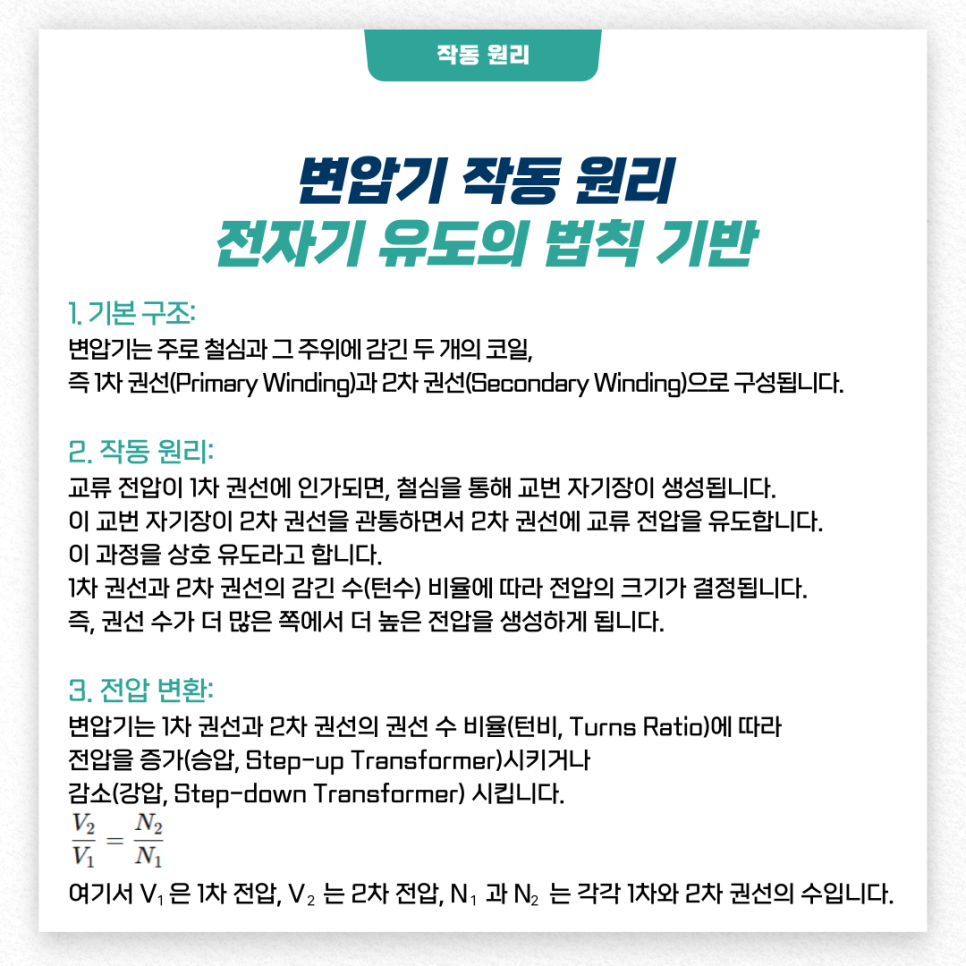 이러한 작동 원리의 과정을 지나 변압기는 1차 권선과 2차 권선의 권선 수 (턴비)에 따라 전압을 증가 시키거나, 감소 시킵니다.